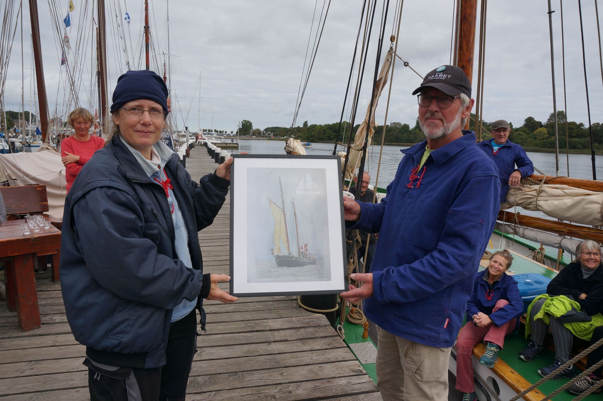 Die Faaborger kamen mit den Schiffen „Schrødersminde“ und der Galeasse „Haabet“. Mit einem Schluck „Gammel Danks“ wurden die Crews begrüßt, und es entwickelten sich intensive Gespräche über Schiffe und Häfen, über Pläne und Ideen. Frode Mortensen, überreichte eine gerahmte Grafik der beiden dänischen Schiffe und erklärte, dass sein Verein eigentlich nur einen kleinen Ausflug machen wollte mit all denen, die das ganze Jahr über tatkräftig daran mitarbeiten, die Holzschiffe zu erhalten. ⚓️