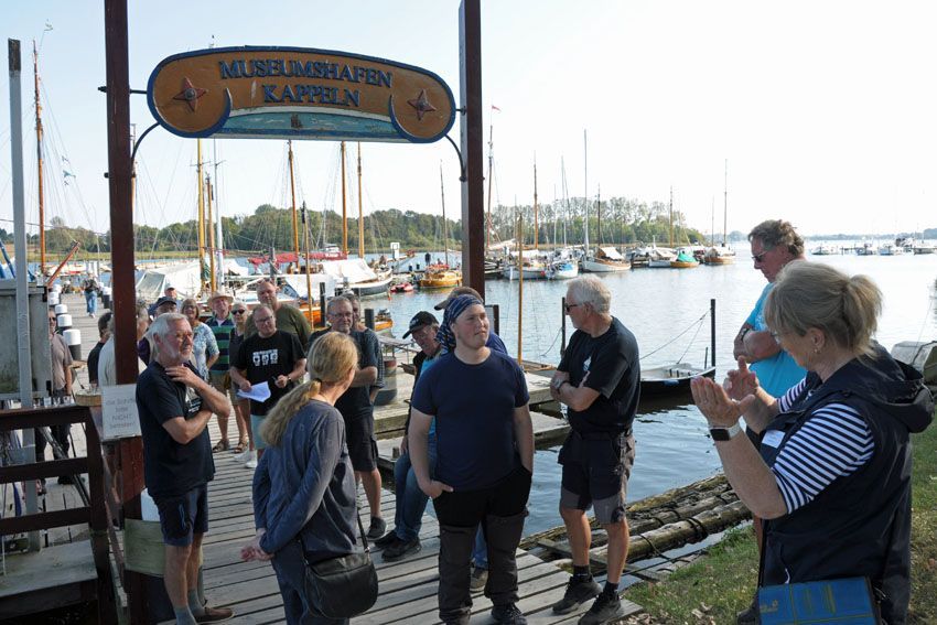 Nach dem ersten fröhlichen Austausch u. a. über den 125. Geburtstag der Galeasse „Haabet“, den die Dänen nur eine Woche vorher gefeiert haben, und einer kurzen Pause stand eine maritime Stadtführung auf dem Plan. Hierzu hatte die Stadt Kappeln beide Museumsvereine eingeladen, da Kappeln seit 1984 die Partnerstadt von Faaborg ist. Frank Germighausen, seit 2018 Stadtvertreter und privat auch Segler, begleitete die Führung. Der Stadtführerin Herta Itzke standen Randi Korsgaard, ehemalige Kappelner Pastorin, und ihr Mann Lorenz, als dänische Übersetzer zur Seite. Informativ und lustig ging es durch die Straßen und selbst die Einheimischen konnten ihr Wissen über Kappeln erweitern.