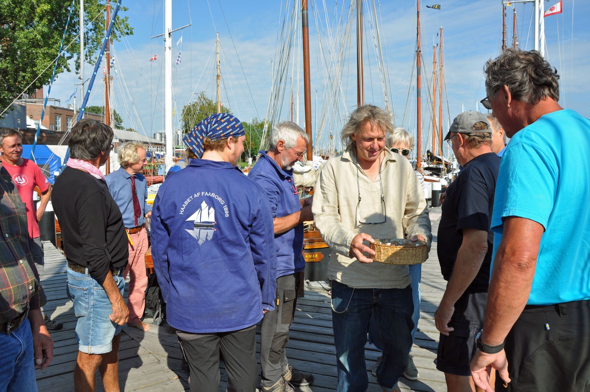 Zur Begrüßung gab es herrlich lauwarmen „Gammel Dansk“ mit Sild. Der Vorsitzende Frode Mortensen überreichte uns ein Buch über die Historie des Faaborger Vereins und eine Flasche mit Selbstgebranntem. Von unserer Seite gab es für jedes Schiff eine Flasche mit eigenes aufgesetzten Rum, und für die Dänin mit den leckeren Pinguin-Happen vom Fest 2022 ein physikalische Wasserspiel - natürlich mit einem Pinguin.